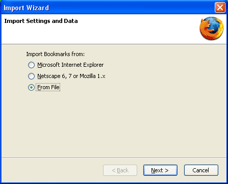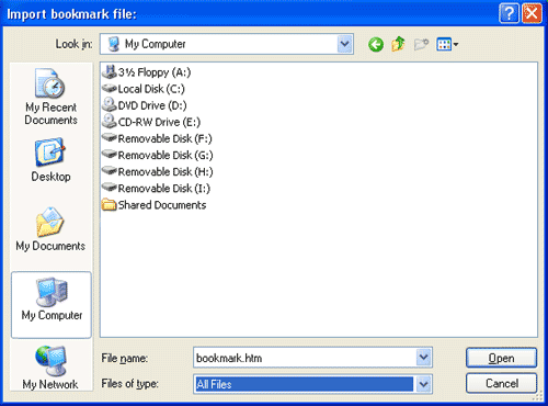 Note: There is no option to select a specific folder to import to. Imported folders will all be placed in the main bookmark folder.