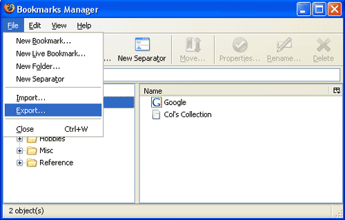 | 2 This opens the Bookmarks Manager Click on "File" Choose "Export" |