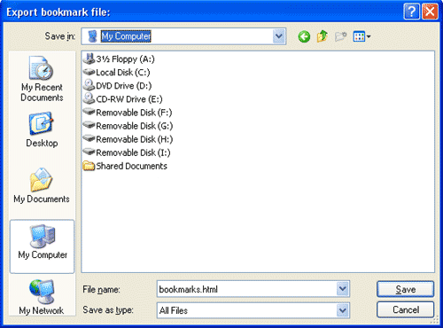 | 3 Choose location you want to save file to Click "Save" You now have a bookmark.html file. |